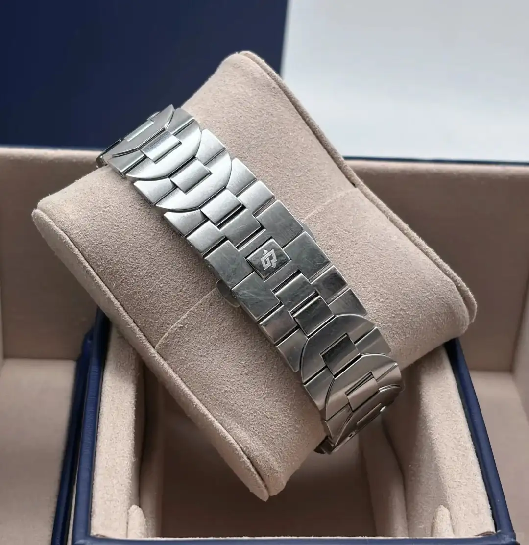 - Protecting the dial is a scratch-resistant sapphire crystal, ensuring long-lasting clarity and preserving the watch’s pristine appearance over time. Completing the design is a stainless-steel bracelet, delivering a sturdy yet stylish wearing experience that enhances the watch’s elegant-sporty character. The bracelet’s polished construction adds modern sophistication and durability for active lifestyles. A secure stainless-steel folding clasp ensures ease of use and reliable wrist security.